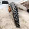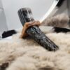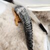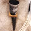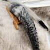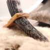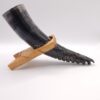 The holder paired with this winged drinking horn comes from recycled wood and has been carefully carved to bring out the tiny feature that makes this horn unique in a big way.