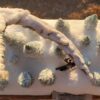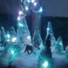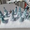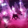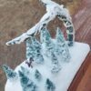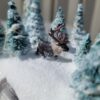 A beautiful wintry setting amidst a towering antler tree with a single sculpted caribou wandering throughout the small forest. This is a perfect addition to any hutch or holiday collection and it is a unique, one-of-a-kind piece built from a wooden base up to a real antler shed carved and painted with wintry patterns. Fake snow blankets the entire scene glittering like true freshly fallen snow in the sunlight. In the evening, turn on the battery-operated lights with the included remote control and illuminate the scene with dazzling colors from vivid red to pale blue or set the mode to chase, fade, twinkle, and more!
